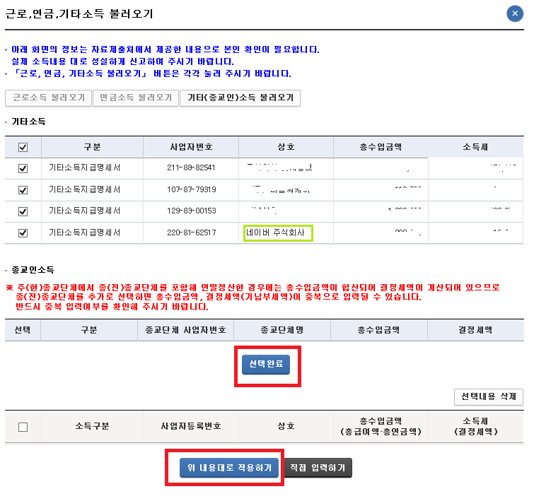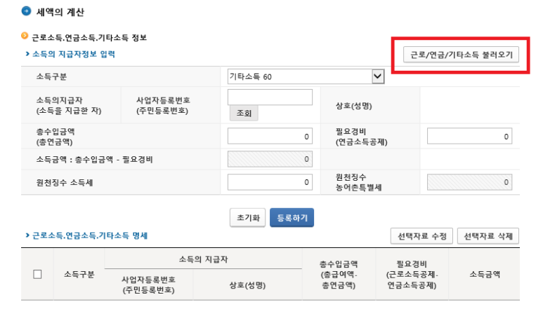 6. 우측 상단에 [근로/연금/기타소득 불러오기]