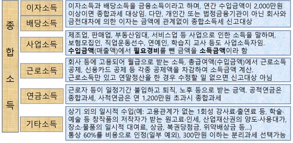 우리의 소득은 여러가지 경로로 이루어져요. 이자, 배당, 사업, 근로, 연금, 기타 등 6가지 소득이 있으면, 이 모든 소득을 합산해서 신고해야 해요.